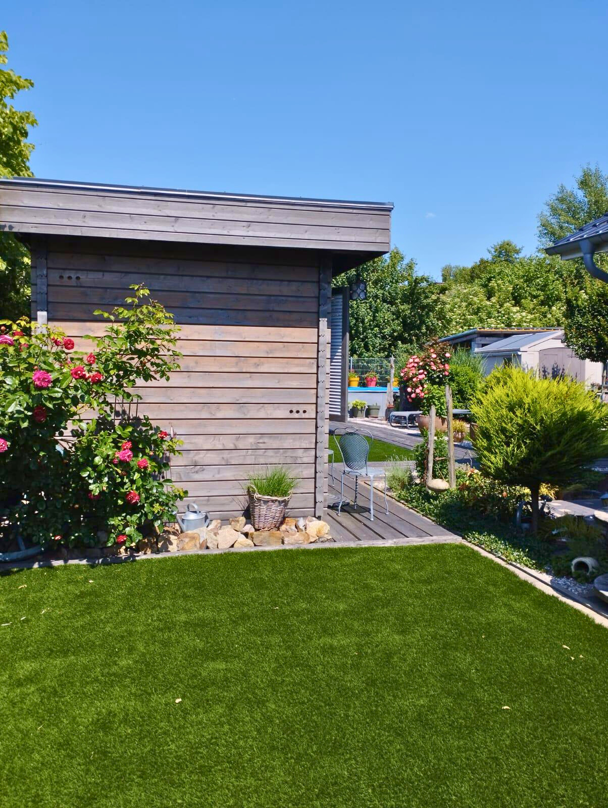 Auch der Außenbereich lässt keine Wünsche offen: Der liebevoll angelegte Garten verfügt über eine Bewässerungsanlage mit Brunnenwasser und bietet zahlreiche Highlights. Eine gemütliche Sauna mit Vorraum lädt zum Entspannen ein, während ein kleiner beheizbarer Pool an warmen Tagen für Erfrischung sorgt. Ein separates Holzlager bietet praktischen Stauraum für Kaminholz.