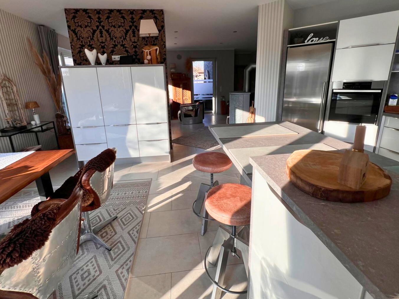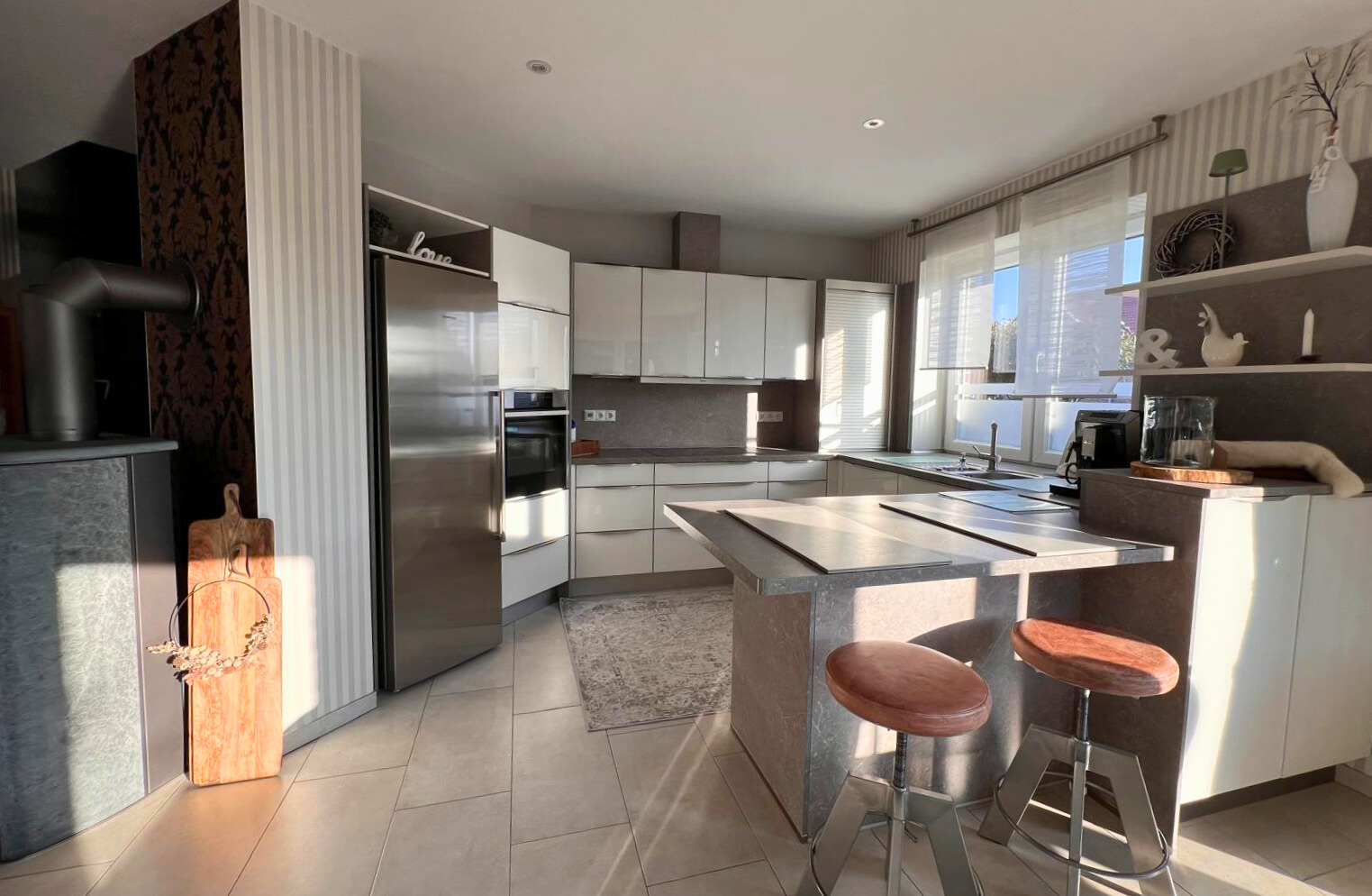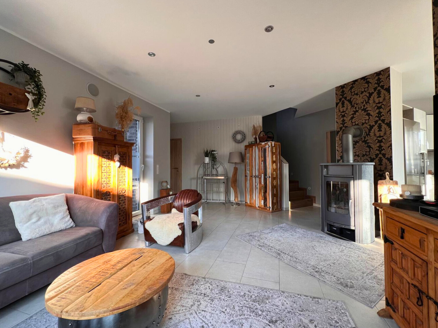 Herzstück der Immobilie ist der offen gestaltete Wohn-, Ess- und Küchenbereich. Große Fensterflächen im Wohnzimmer sorgen für viel Tageslicht und schaffen eine angenehme Wohnatmosphäre mit Blick in den gepflegten Garten. Ein wasserführender Kaminofen sorgt nicht nur für gemütliche Stunden, sondern unterstützt zugleich effizient das Heizsystem. Die vorhandene Einbauküche ist bereits im Kaufpreis enthalten und fügt sich harmonisch in das offene Raumkonzept ein.