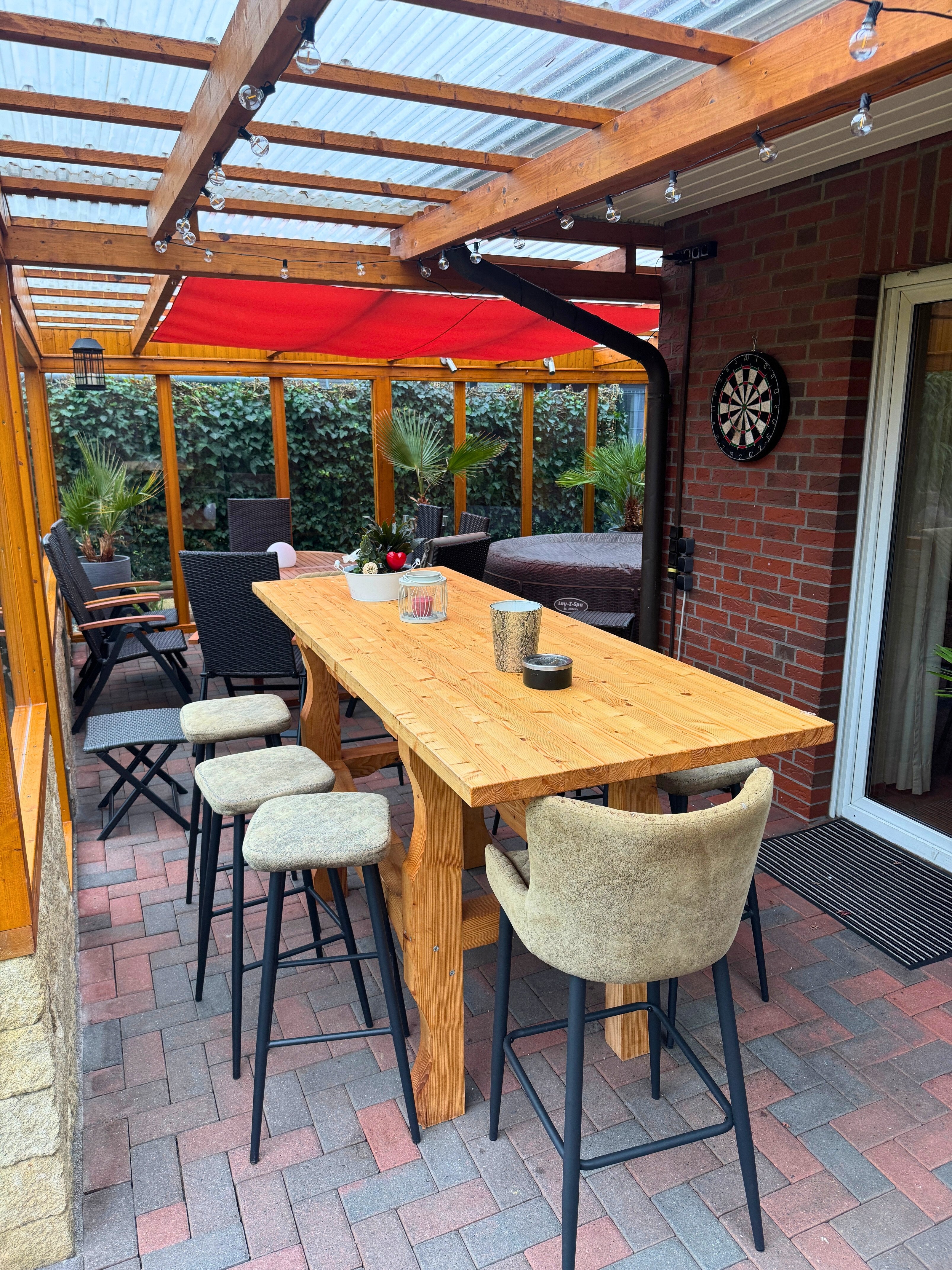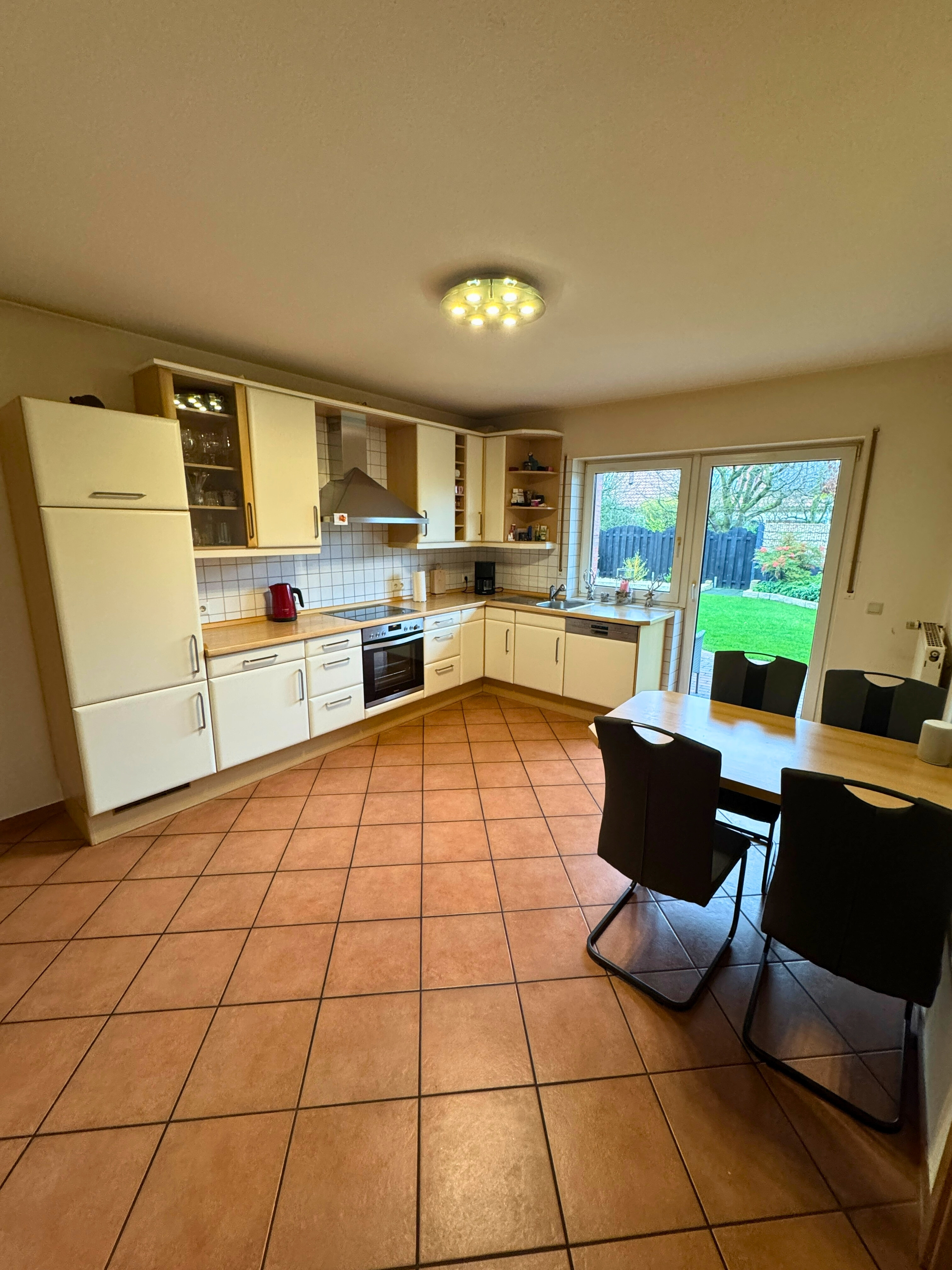 Die Einbauküche ist im Kaufpreis enthalten und bietet alles, was Hobbyköche benötigen. Vom Wohn- und Essbereich aus gelangen Sie direkt auf die Außenterrasse sowie die angrenzende überdachte Terrasse. Beide Bereiche bieten einen schönen Blick auf den gepflegten Garten, der sich ideal für Familien, Gartenfreunde oder gemütliche Stunden im Freien eignet.