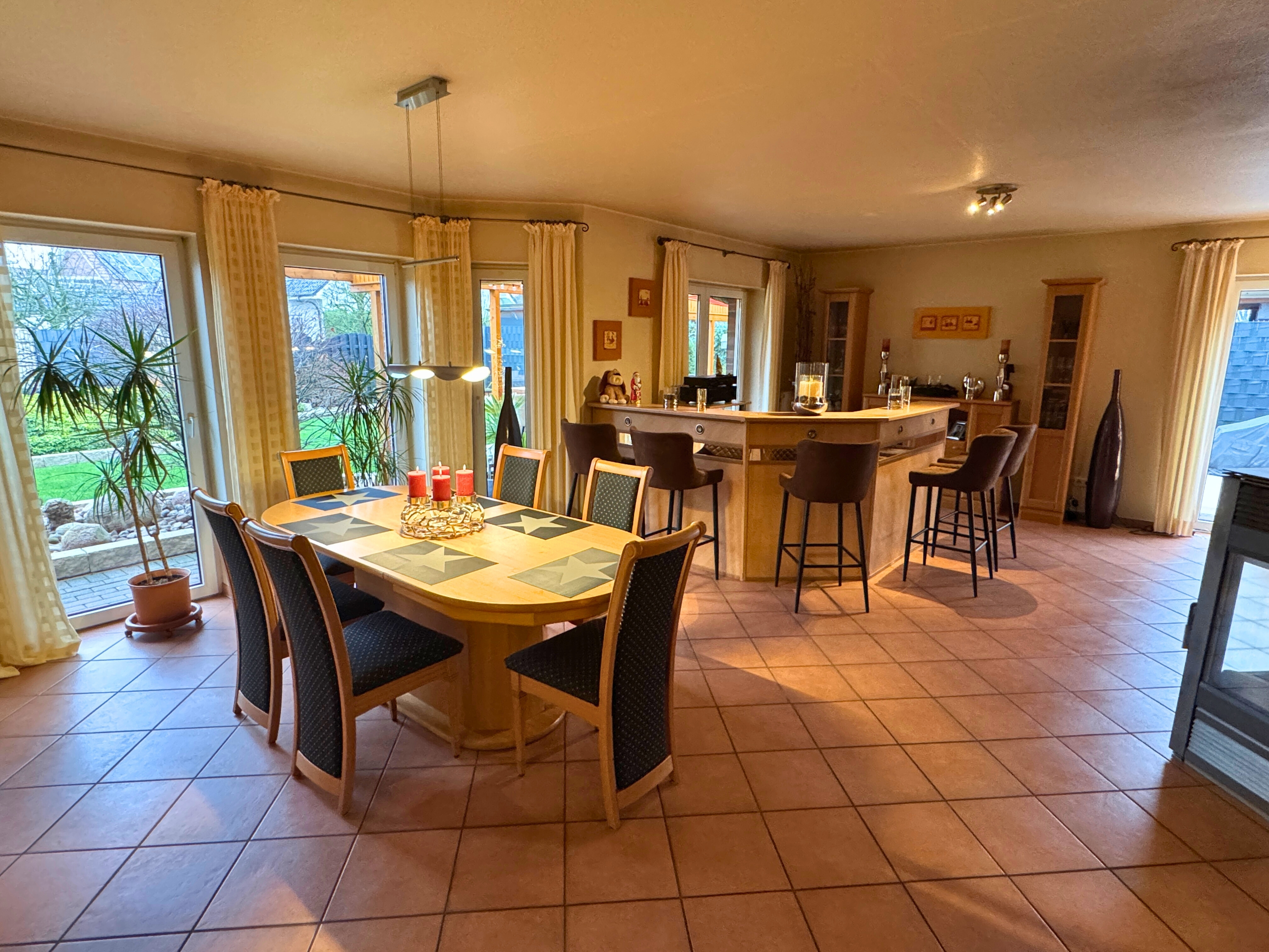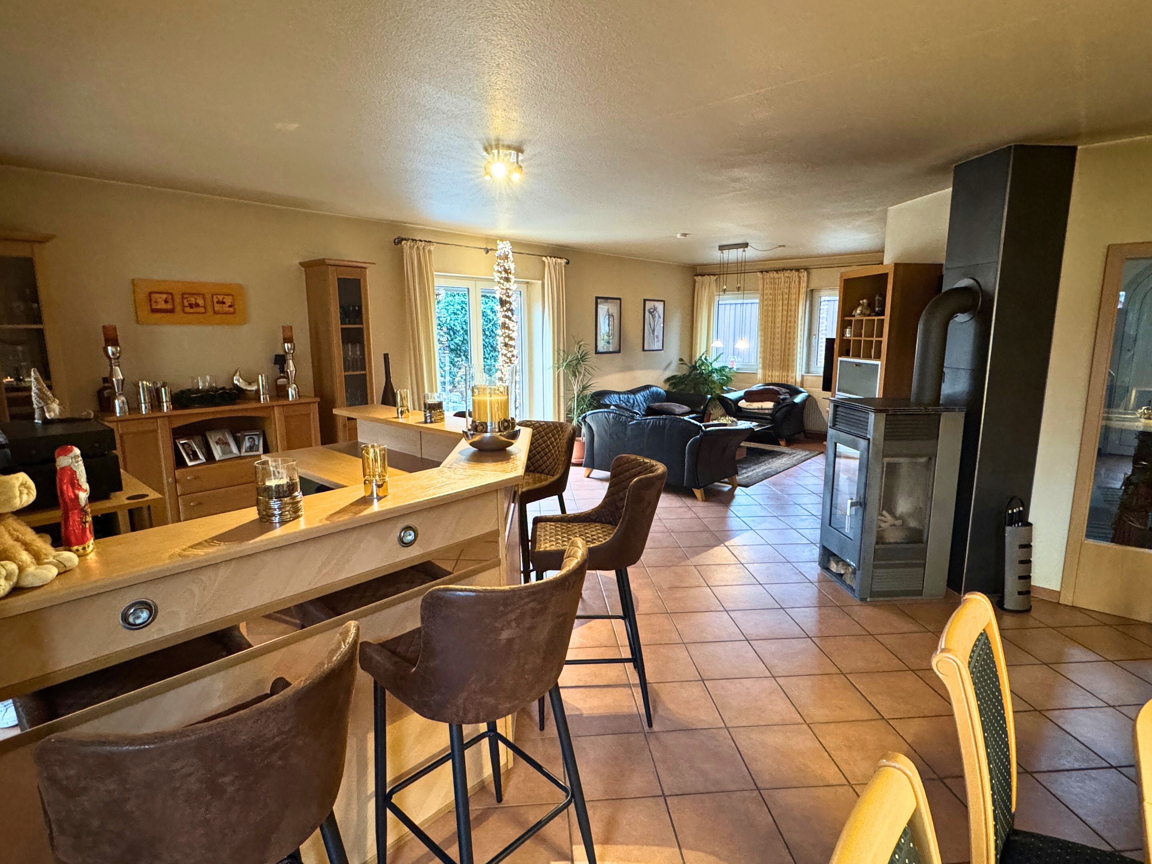 Schon beim Betreten überzeugt der helle, weitläufige Eingangsbereich, der nahtlos in das großzügige Wohn- und Esszimmer übergeht. Große Fensterflächen sorgen für eine angenehme Lichtdurchflutung und schaffen eine einladende Wohnatmosphäre. Ein gemütlicher Ofen im Wohnbereich verleiht dem Raum zusätzlichen Charme und sorgt in den kühleren Monaten für wohlige Wärme. Ergänzend ist das Wohnzimmer, ebenso wie Küche und Bad, mit einer Fußbodenheizung bzw. Rücklauferwärmung ausgestattet.