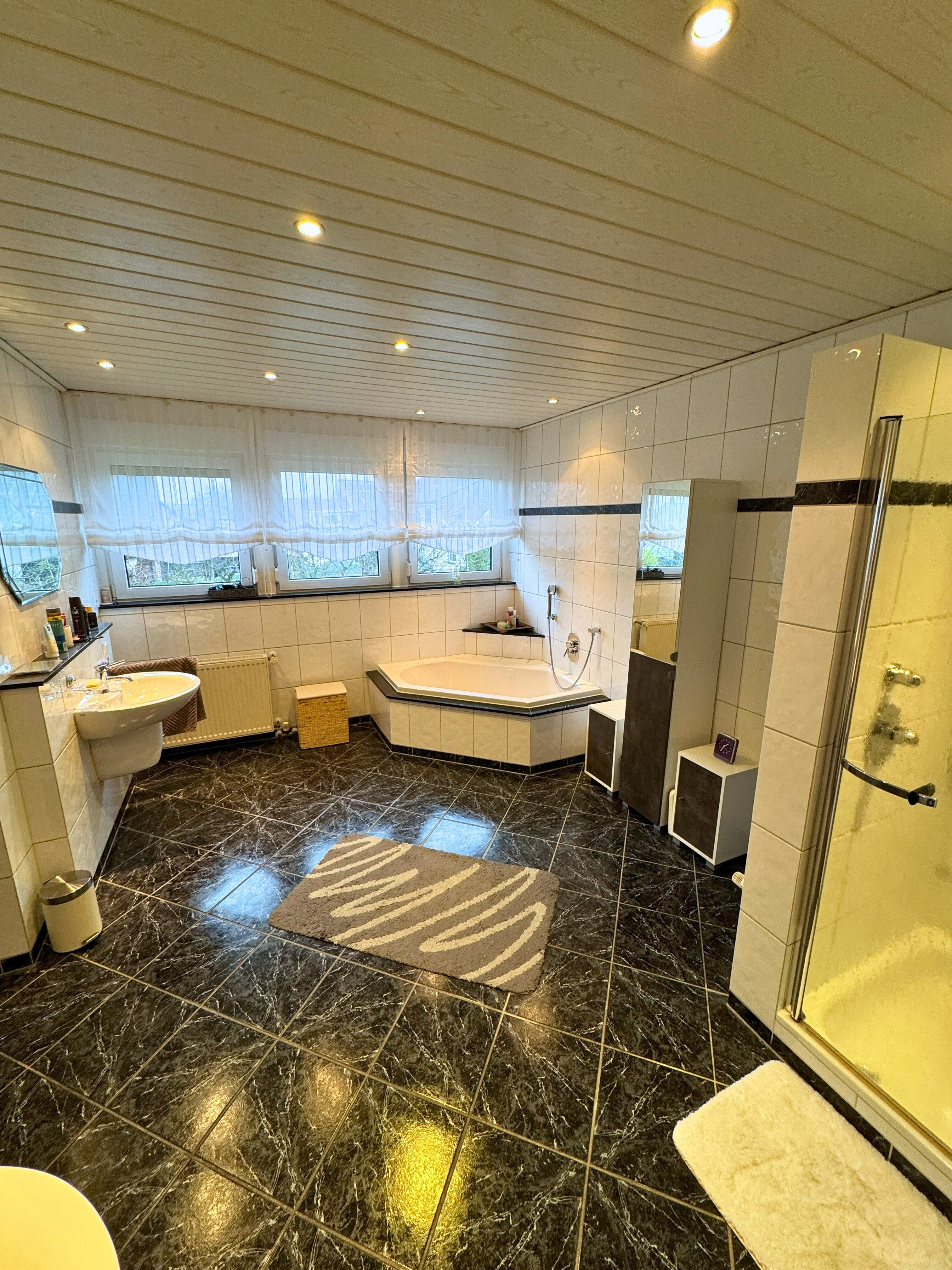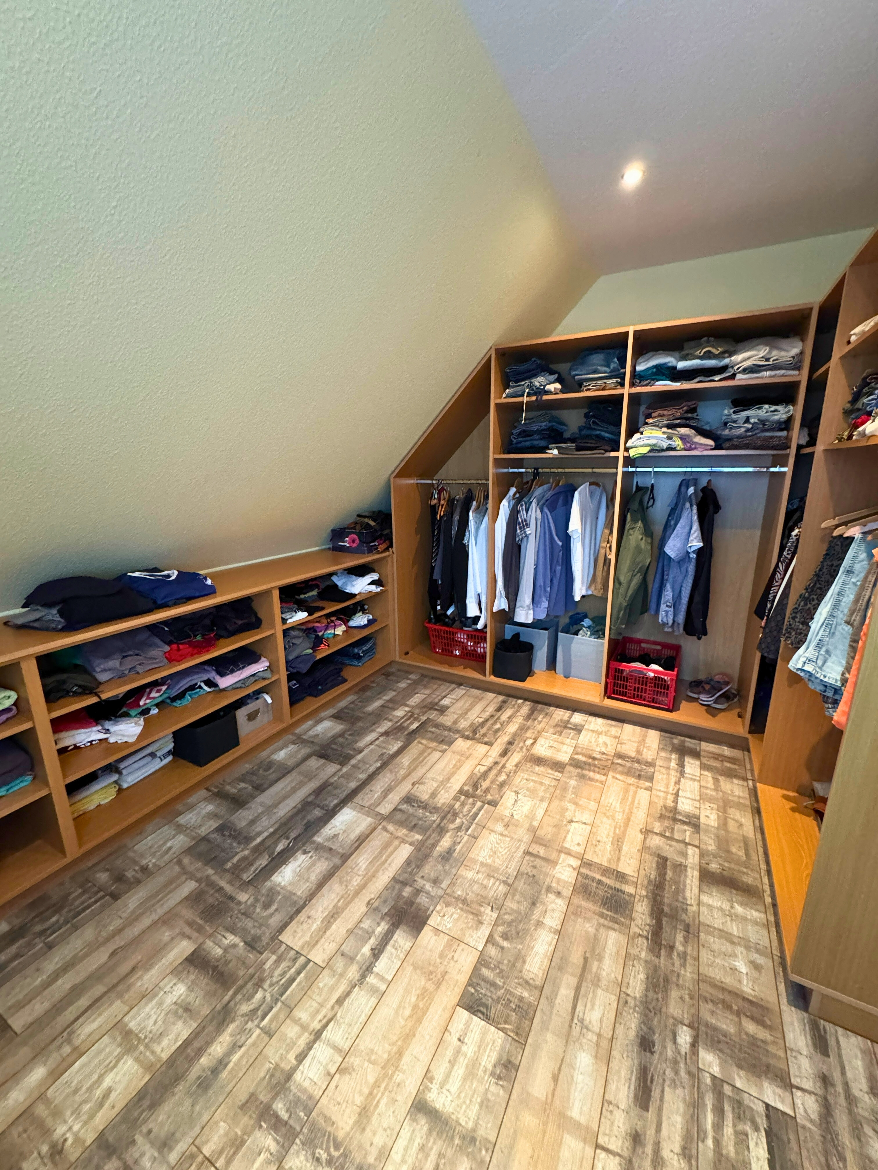 Im Obergeschoss überzeugt das Haus mit einem Elternschlafzimmer inklusive separatem Ankleideraum sowie drei weiteren Schlafzimmern – perfekt für Kinder, Gäste oder ein Homeoffice. Das große Familienbad mit zwei Waschtischen, Dusche und Badewanne bietet viel Raum für die gesamte Familie. Der Dachboden ist über eine feste Holztreppe erreichbar und bietet hervorragende Ausbaureserven – ideal für zusätzliche Wohn- oder Arbeitsräume.